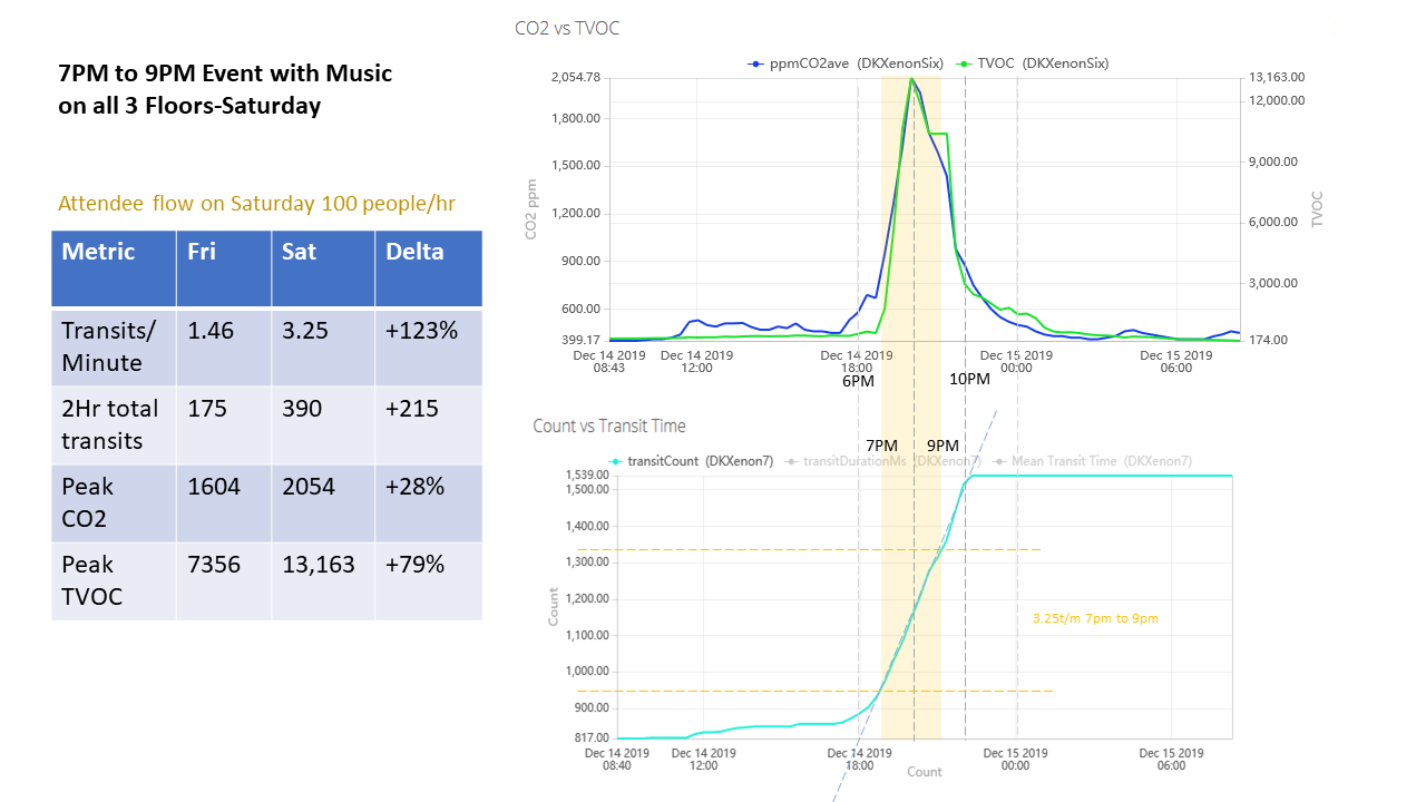 Example of a Trellis or Lattice plot showing a comparison of event attendee flow and corresponding increase in CO2 and TVOC levels. The TVOC in green response is very strong due to the presence of ethanol alcohol from alcoholic beverages.